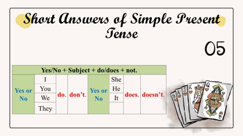 Short Answers of Simple Present Tense 05 Yes/No + Subject + do/does + not. I She Yes or You do. don’t. Yes or He does. doesn’t. No We No It They
