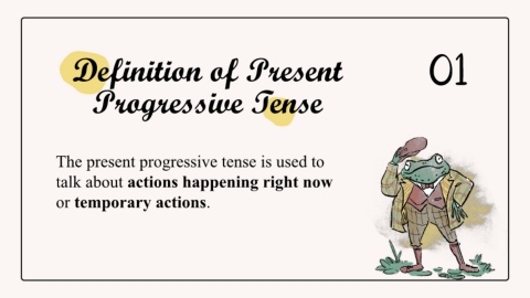 Definition of Present 01 Progressive Tense The present progressive tense is used to talk about actions happening right now or temporary actions.