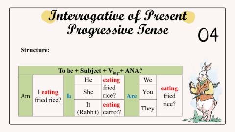 Interrogative of Present Progressive Tense 04 Structure: To be + Subject + V .+ ANA? ing He eating We fried eating I eating She You Am Is rice? Are fried fried rice? It eating rice? (Rabbit) carrot? They