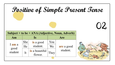 Positive of Simple Present Tense 02 Subject + to be + ANA (Adjective, Noun, Adverb) Am Is Are She is a good You I am a He student. We are a good good student It is a beautiful They student. flower.
