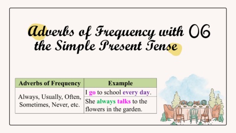 Adverbs of Frequency with 06 the Simple Present Tense Adverbs of Frequency Example I go to school every day. Always, Usually, Often, Sometimes, Never, etc. She always talks to the flowers in the garden.