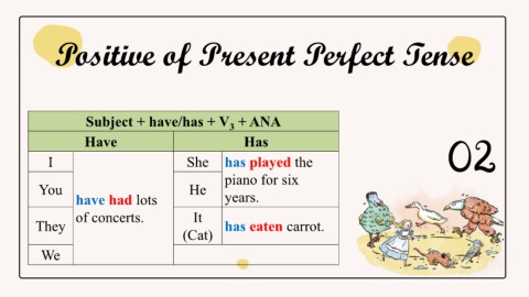 Positive of Present Perfect Tense Subject + have/has + V + ANA 3 Have Has I She has played the 02 piano for six You He have had lots years. of concerts. It They has eaten carrot. (Cat) We