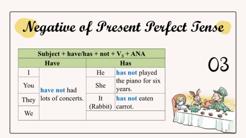 Negative of Present Perfect Tense Subject + have/has + not + V + ANA 3 Have Has 03 I He has not played the piano for six You She have not had years. They lots of concerts. It has not eaten (Rabbit) carrot. We
