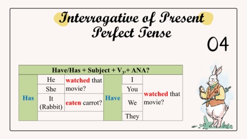 Interrogative of Present Perfect Tense 04 Have/Has + Subject + V .+ ANA? 3 He watched that I She movie? You Has It Have watched that movie? (Rabbit) eaten carrot? We They