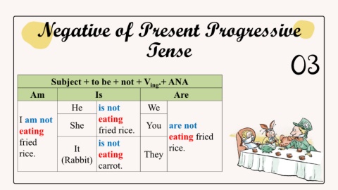 Negative of Present Progressive Tense 03 Subject + to be + not + V .+ ANA ing Am Is Are He is not We I am not She eating You are not eating fried rice. eating fried fried is not rice. rice. It eating They (Rabbit) carrot.