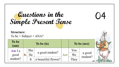 Questions in the 04 Simple Present Tense Structure: To be + Subject + ANA? To be To be (is) To be (are) (am) Am I a She a good student? You a good good Is He Are We student? It a beautiful flower? They student?