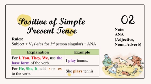 Subject + V (-s/es for 3 person singular) + ANA Noun, Adverb)