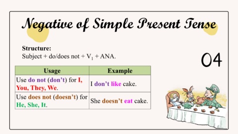Negative of Simple Present Tense Structure: Subject + do/does not + V + ANA. 04 1 Usage Example Use do not (don’t) for I, I don’t like cake. You, They, We. Use does not (doesn’t) for She doesn’t eat cake. He, She, It.