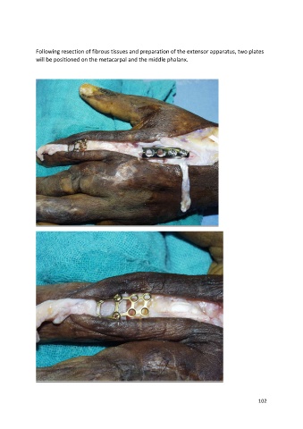 Following resection of fibrous tissues and preparation of the extensor apparatus, two plates will be positioned on the metacarpal and the middle phalanx. 102