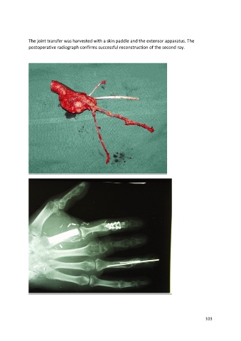 The joint transfer was harvested with a skin paddle and the extensor apparatus. The postoperative radiograph confirms successful reconstruction of the second ray. 103