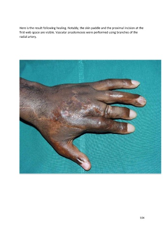 Here is the result following healing. Notably, the skin paddle and the proximal incision at the first web space are visible. Vascular anastomoses were performed using branches of the radial artery. 104