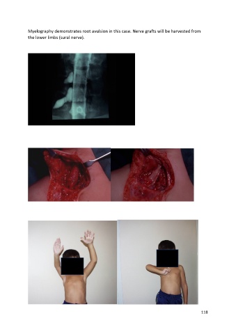 Myelography demonstrates root avulsion in this case. Nerve grafts will be harvested from the lower limbs (sural nerve). 118