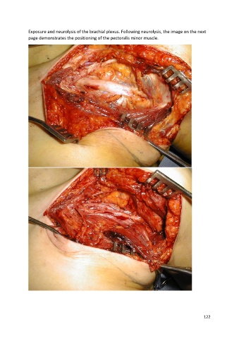 Exposure and neurolysis of the brachial plexus. Following neurolysis, the image on the next page demonstrates the positioning of the pectoralis minor muscle. 122