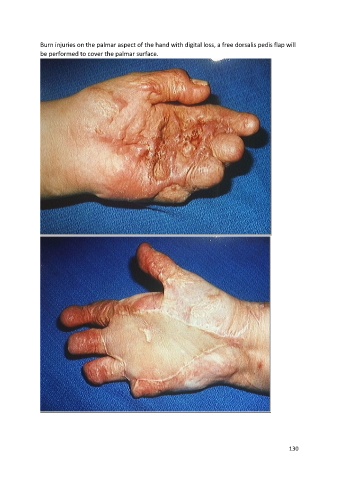 Burn injuries on the palmar aspect of the hand with digital loss, a free dorsalis pedis flap will be performed to cover the palmar surface. 130