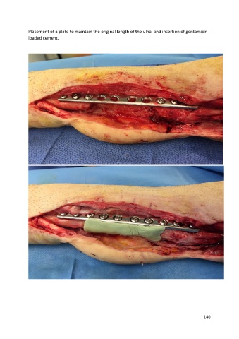 Placement of a plate to maintain the original length of the ulna, and insertion of gentamicin- loaded cement. 140
