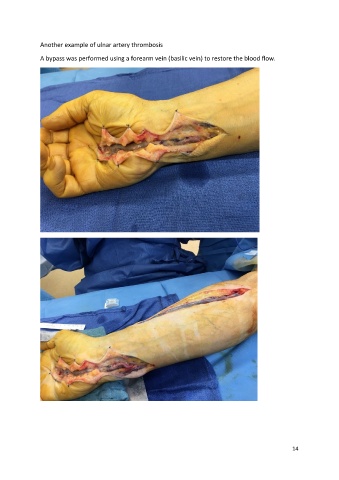 Another example of ulnar artery thrombosis A bypass was performed using a forearm vein (basilic vein) to restore the blood flow. 14