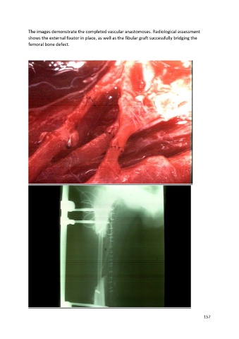 The images demonstrate the completed vascular anastomoses. Radiological assessment shows the external fixator in place, as well as the fibular graft successfully bridging the femoral bone defect. 157