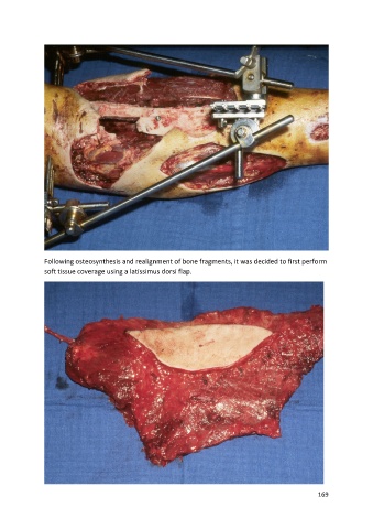 Following osteosynthesis and realignment of bone fragments, it was decided to first perform soft tissue coverage using a latissimus dorsi flap. 169