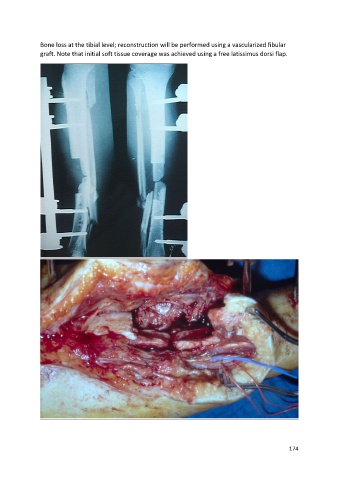 Bone loss at the tibial level; reconstruction will be performed using a vascularized fibular graft. Note that initial soft tissue coverage was achieved using a free latissimus dorsi flap. 174