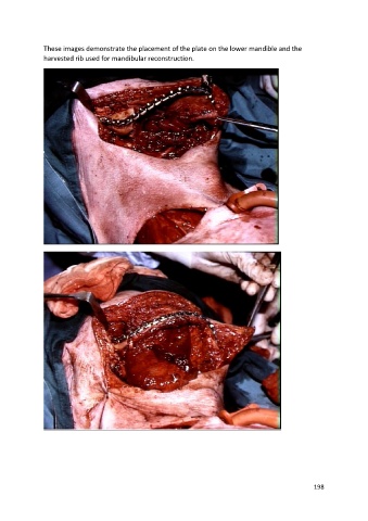 These images demonstrate the placement of the plate on the lower mandible and the harvested rib used for mandibular reconstruction. 198
