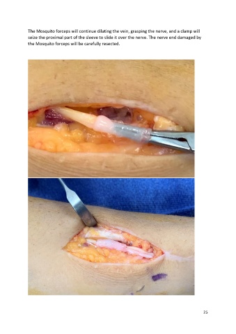The Mosquito forceps will continue dilating the vein, grasping the nerve, and a clamp will seize the proximal part of the sleeve to slide it over the nerve. The nerve end damaged by the Mosquito forceps will be carefully resected. 25