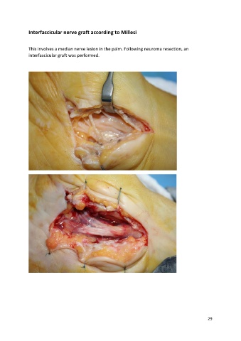 Interfascicular nerve graft according to Millesi This involves a median nerve lesion in the palm. Following neuroma resection, an interfascicular graft was performed. 29