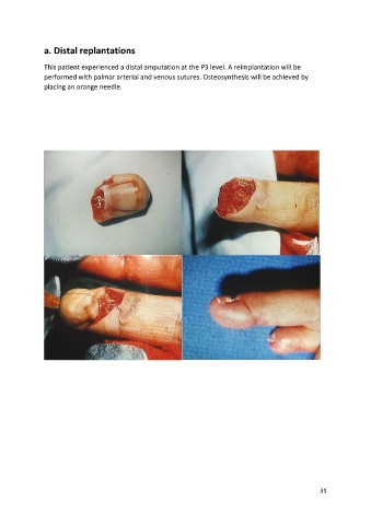 a. Distal replantations This patient experienced a distal amputation at the P3 level. A reimplantation will be performed with palmar arterial and venous sutures. Osteosynthesis will be achieved by placing an orange needle. 31