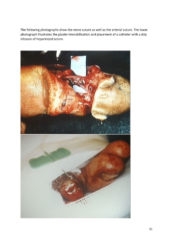 The following photographs show the nerve suture as well as the arterial suture. The lower photograph illustrates the plaster immobilization and placement of a catheter with a drip infusion of heparinized serum. 35