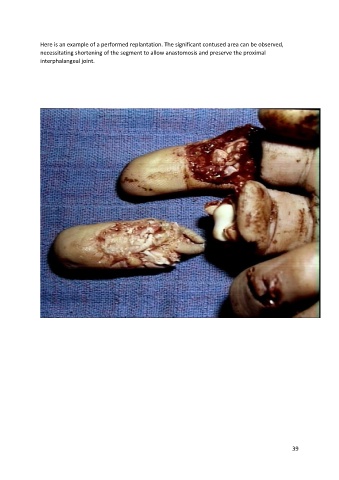 Here is an example of a performed replantation. The significant contused area can be observed, necessitating shortening of the segment to allow anastomosis and preserve the proximal interphalangeal joint. 39