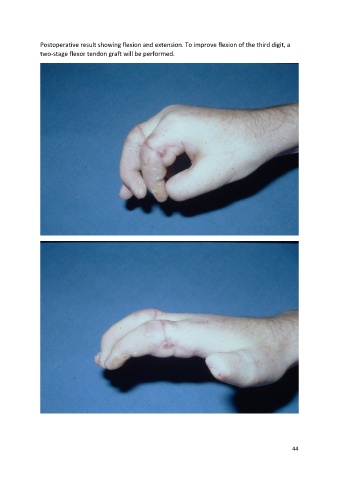 Postoperative result showing flexion and extension. To improve flexion of the third digit, a two-stage flexor tendon graft will be performed. 44