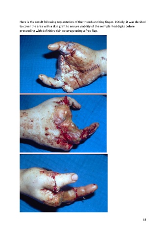 Here is the result following replantation of the thumb and ring finger. Initially, it was decided to cover the area with a skin graft to ensure viability of the reimplanted digits before proceeding with definitive skin coverage using a free flap. 53