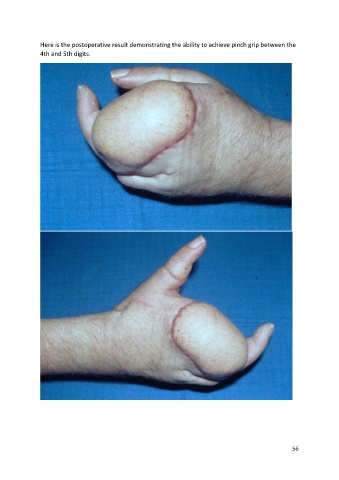 Here is the postoperative result demonstrating the ability to achieve pinch grip between the 4th and 5th digits. 56