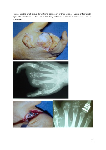 To enhance the pinch grip, a derotational osteotomy of the proximal phalanx of the fourth digit will be performed. Additionally, debulking of the radial portion of the flap will also be carried out. 57