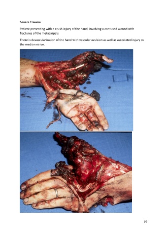 Severe Trauma Patient presenting with a crush injury of the hand, involving a contused wound with fractures of the metacarpals. There is devascularization of the hand with vascular avulsion as well as associated injury to the median nerve. 60