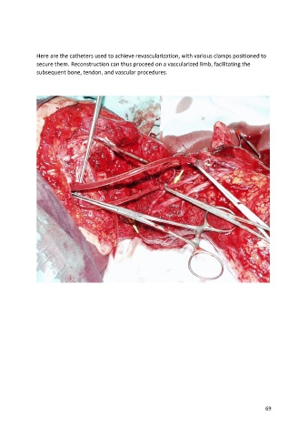 Here are the catheters used to achieve revascularization, with various clamps positioned to secure them. Reconstruction can thus proceed on a vascularized limb, facilitating the subsequent bone, tendon, and vascular procedures. 69
