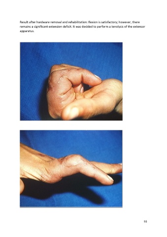 Result after hardware removal and rehabilitation: flexion is satisfactory; however, there remains a significant extension deficit. It was decided to perform a tenolysis of the extensor apparatus. 93