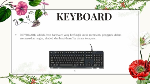 KEYBOARD ◉ KEYBOARD adalah Jenis hardware yang berfungsi untuk membantu pengguna dalam memasukkan angka, simbol, dan huruf-huruf ke dalam komputer. 10