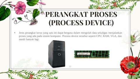 PERANGKAT PROSES (PROCESS DEVICE) ◉ Jenis perangkat keras yang satu ini dapat berguna dalam mengolah data sekaligus menjalankan proses yang ada pada sistem komputer. Process device tersebut seperti CPU, RAM, VGA, dan masih banyak lagi. 12