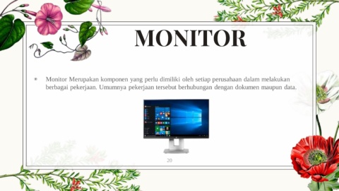 MONITOR ◉ Monitor Merupakan komponen yang perlu dimiliki oleh setiap perusahaan dalam melakukan berbagai pekerjaan. Umumnya pekerjaan tersebut berhubungan dengan dokumen maupun data. 20