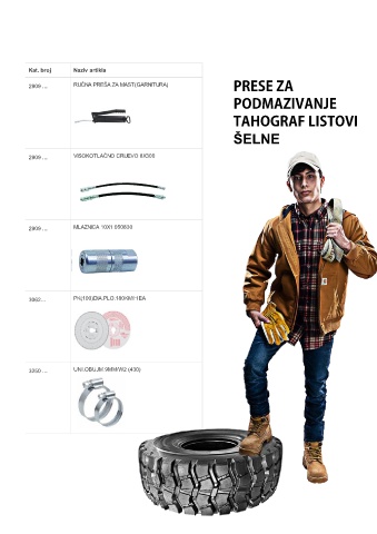 Kat. broj Naziv artikla PRESE ZA 2909 ... RUČNA PREŠA ZA MAST(GARNITURA) PODMAZIVANJE TAHOGRAF LISTOVI ŠELNE 2909 ... VISOKOTLAČNO CRIJEVO 8X300 2909 ... MLAZNICA 10X1 050830 3062... PK(100)DIA.PLO.180KM/H EA 3250 ... UNI.OBUJM.9MM/W2 (430)