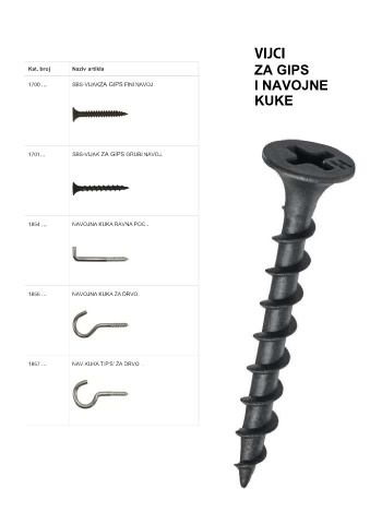 VIJCI ZA GIPS Kat. broj Naziv artikla I NAVOJNE 1700 ... SBS-VIJAKZA GIPS FINI NAVOJ KUKE 1701... SBS-VIJAK ZA GIPS GRUBI NAVOJ. 1854 ... NAVOJNA KUKA RAVNA POC.. 1856 ... NAVOJNA KUKA ZA DRVO. 1857 ... NAV.KUKA TIP'S' ZA DRVO .