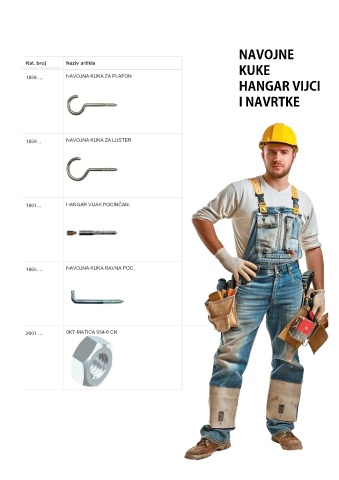 NAVOJNE Kat. broj Naziv artikla KUKE 1858 ... NAVOJNA KUKA ZA PLAFON HANGAR VIJCI I NAVRTKE 1859 .. NAVOJNA KUKA ZA LUSTER 1861... HANGAR VIJAK POCINČAN. 1865 ... NAVOJNA KUKA RAVNA POC. 2001 ... 6KT-MATICA 934-8 CN