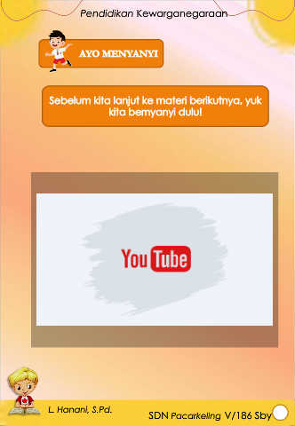 Pendidikan Kewarganegaraan AYO MENYANYI Sebelum kita lanjut ke materi berikutnya, yuk kita bernyanyi dulu! https://youtu.be/Y4VvKOzlWmw L. Hanani, S.Pd. SDN Pacarkeling V/186 Sby