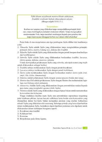 Pada ŝloka di atas menjelaskan ada tiga pembagian Yajña dilihat dari kualitasnya