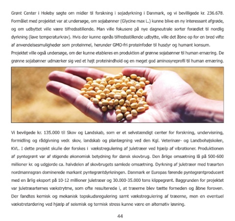 Grønt Center i Holeby søgte om midler til forskning i sojadyrkning i Danmark, og vi bevilligede kr. 236.678.