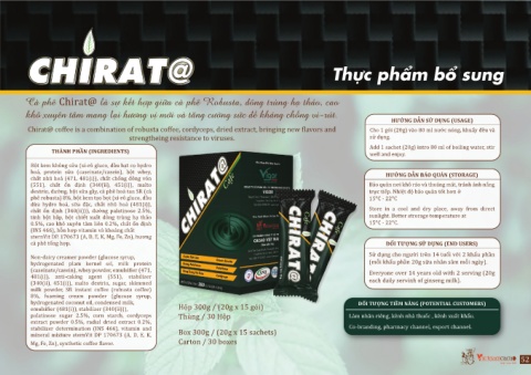 Chirat@ coffee is a combination of robusta coffee, cordyceps, dried extract, bringing new �lavors and Cho 1 gói (20g) vào 80 ml nước nóng, khuấy đều và