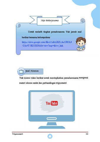 AYo Bekerjasama Untuk melatih tingkat pemahmanmu Yuk jawab soal berikut bersama kelompokmu Yuk Nonton Yuk tonton video berikut untuk meningkatkan pemahamnamu mengenai materi ukuran sudut dan perbandingan trigoometri Trigonometri 32