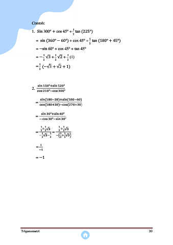 Contoh: 1. Sin 300 + cos 45 + tan 225 2 = sin 360 − 60 + cos 45 + tan 180 + 45 2 = −sin 60 + cos 45 + tan 45 = − 3 + 2 + (1) 2 2 2 = − 3 + 2 + 1 2 5 : 2 2. 2 ; 8 ; : 8 ;6 = 8 : ; 27 : : 6 = ; ; : : = = ; ; ;( : ) = ; = −1 Trigonometri 39