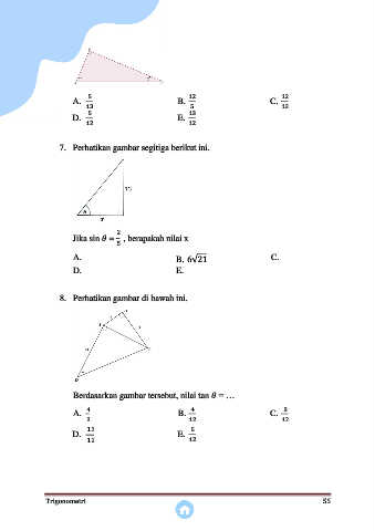 2 2 A. 5 B. C. 5 D. 5 E. 2 2 7. Perhatikan gambar segitiga berikut ini. 2 Jika sin = , berapakah nilai x 5 A. B. 6 21 C. D. E. 8. Perhatikan gambar di bawah ini. Berdasarkan gambar tersebut, nilai tan = … 4 4 A. B. C. 2 2 5 D. E. 2 2 Trigonometri 55