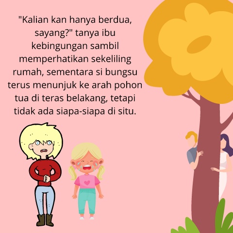 "Kalian kan hanya berdua, sayang?" tanya ibu kebingungan sambil memperhatikan sekeliling rumah, sementara si bungsu terus menunjuk ke arah pohon tua di teras belakang, tetapi tidak ada siapa-siapa di situ.